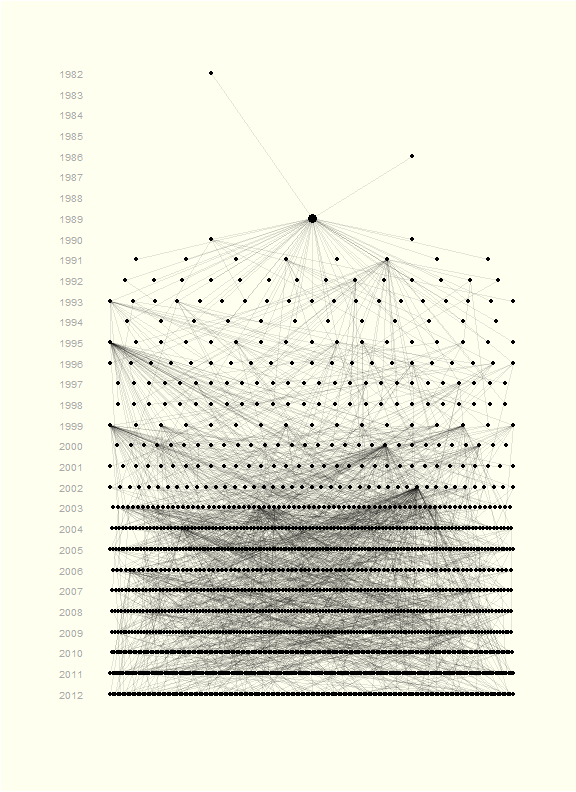 I’ve had a few requests for the code, so in this post, I provide a step by step guide describing how the graph was produced. In a nutshell, it shows all ancestors and descendants of a single Soay sheep, called “Snowball”, who is indicated by the large dot at the top of the pedigree.